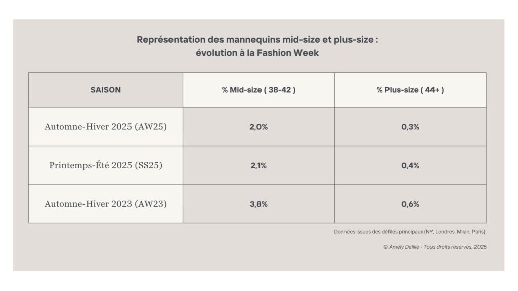 Lors des Fashion Weeks automne/hiver 2025, la représentation des mannequins de taille moyenne (mid-size) et grande taille (plus-size) a connu une régression notable.